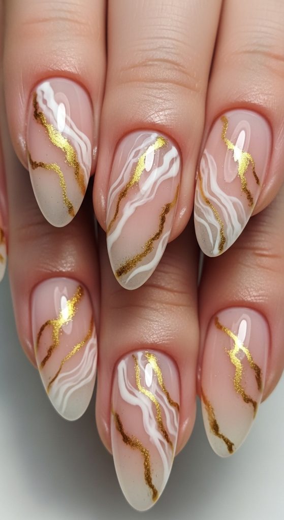Marble nail art adds a sophisticated and artistic feel to your manicure. Combining peach with white and subtle gold or grey veins creates a stunning marble effect. Each nail becomes unique, making this design perfect for those who appreciate creative nail art.
