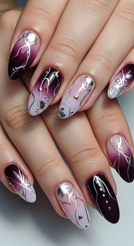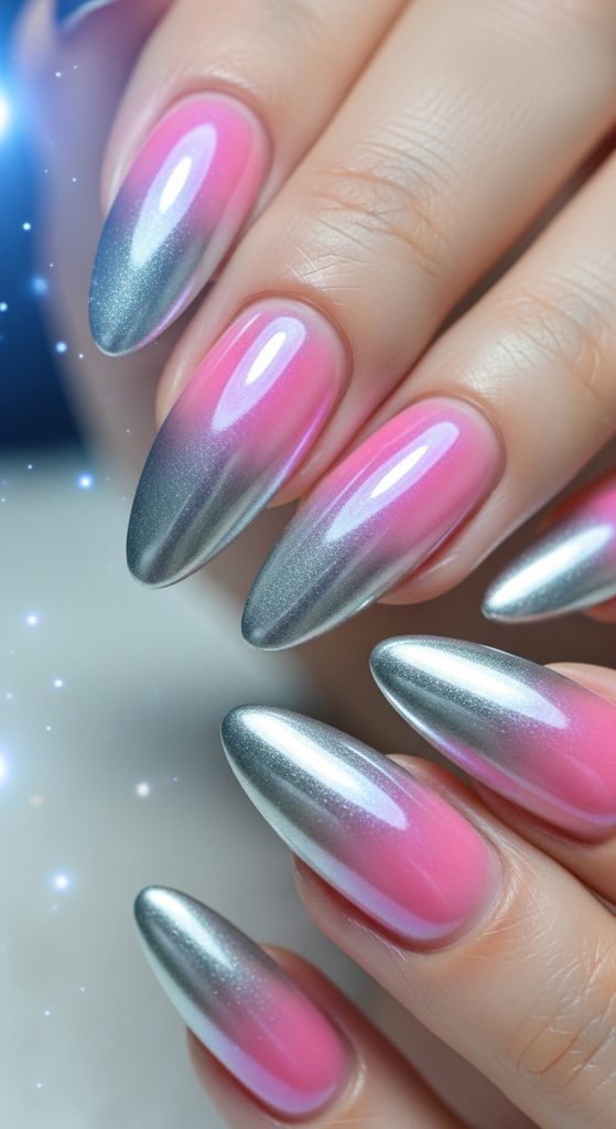 Chrome finishes bring a futuristic shine to ombre nails. Blend a metallic chrome tip into a soft base for a sleek and glamorous look. Silver chrome on a pale pink base is especially popular for a high-fashion vibe.