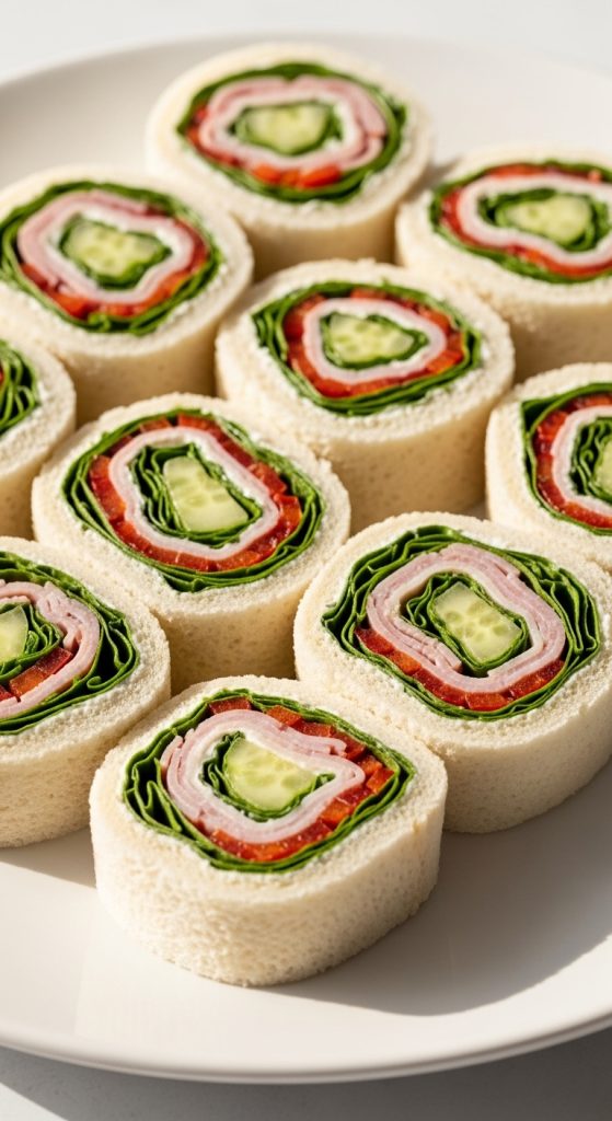 Pinwheel sandwiches are both visually appealing and easy to eat. Made by rolling up tortillas or bread with fillings like cream cheese, ham, turkey, or vegetables, they are sliced into small spiral bites.