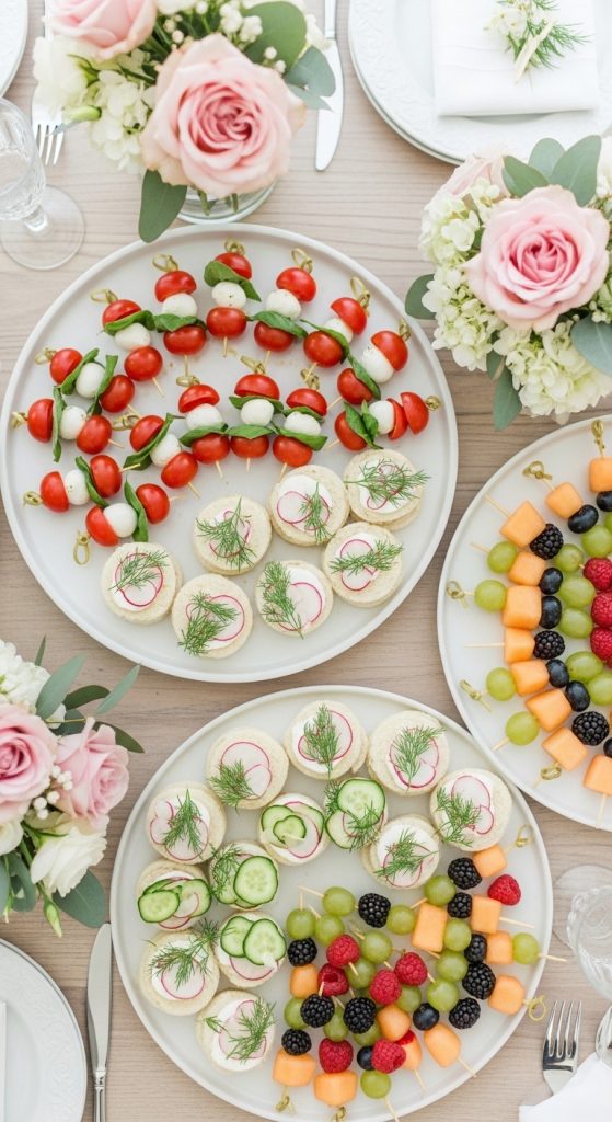 Mini Caprese skewers are a fresh and colorful option that adds a touch of sophistication to your bridal shower table. These bite-sized appetizers are made with cherry tomatoes, mozzarella balls, and fresh basil leaves drizzled with balsamic glaze. They’re light, refreshing, and incredibly easy to prepare.