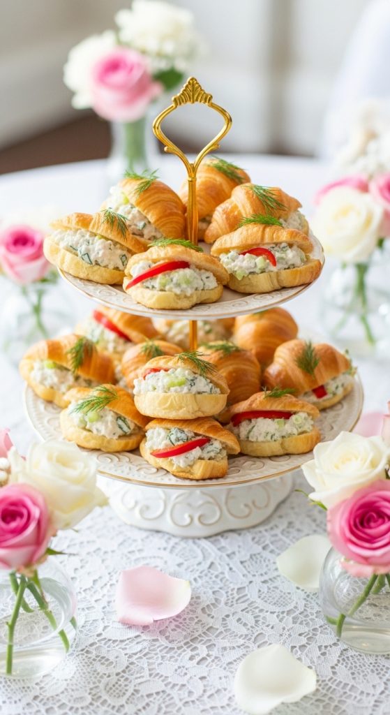 Chicken salad served in mini croissant halves or small sliders makes for a delicious and filling finger food option. The buttery croissant pairs perfectly with creamy chicken salad, creating a rich and satisfying bite.