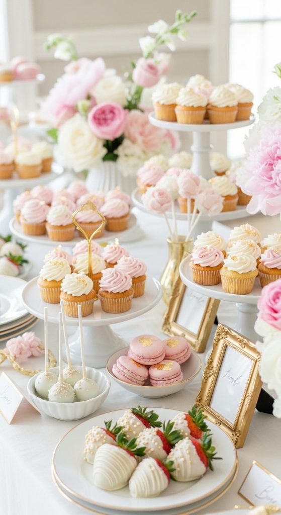 No bridal shower is complete without dessert. Mini cupcakes, macarons, cake pops, and chocolate-dipped strawberries are perfect finger-sized sweets that satisfy guests without overwhelming them.