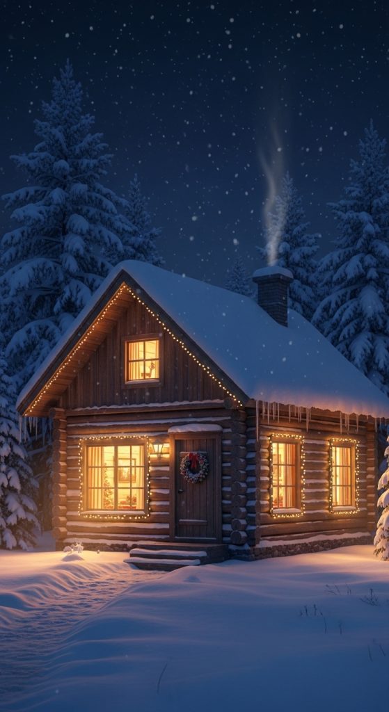One of the most popular cute wallpaper themes is a cozy winter night scene. Imagine a small cabin glowing warmly with lights, surrounded by gently falling snow. Soft lights in windows, smoke rising from the chimney, and a calm snowy forest create a peaceful and heartwarming atmosphere.