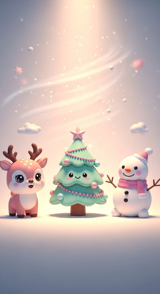 You might see pastel Christmas trees, soft clouds, or gentle snowfall combined with cute elements like stars, hearts, and sparkles. This style is especially popular on social media and gives a modern, stylish look.