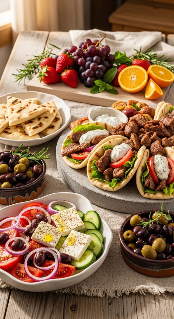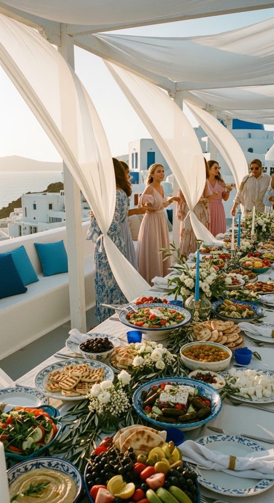 Serve a menu inspired by Greek cuisine to match the theme. Include dishes like: