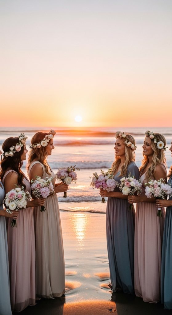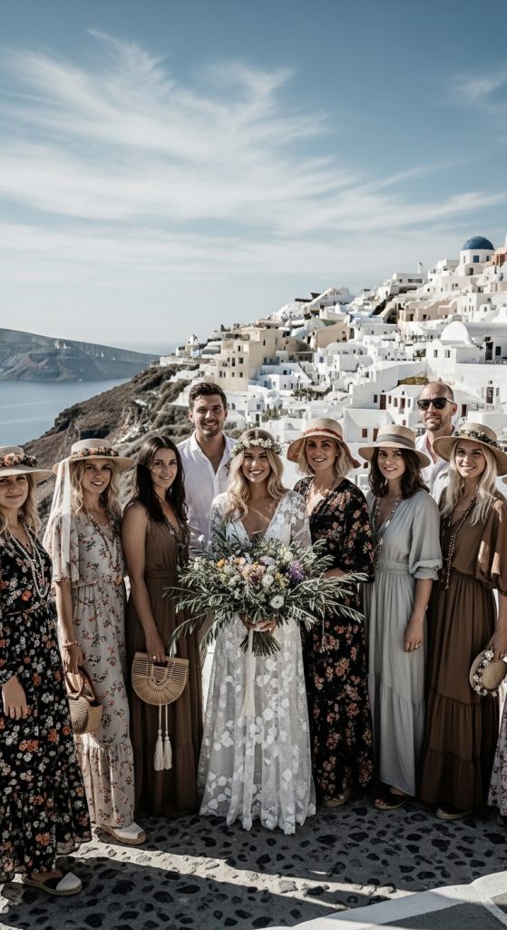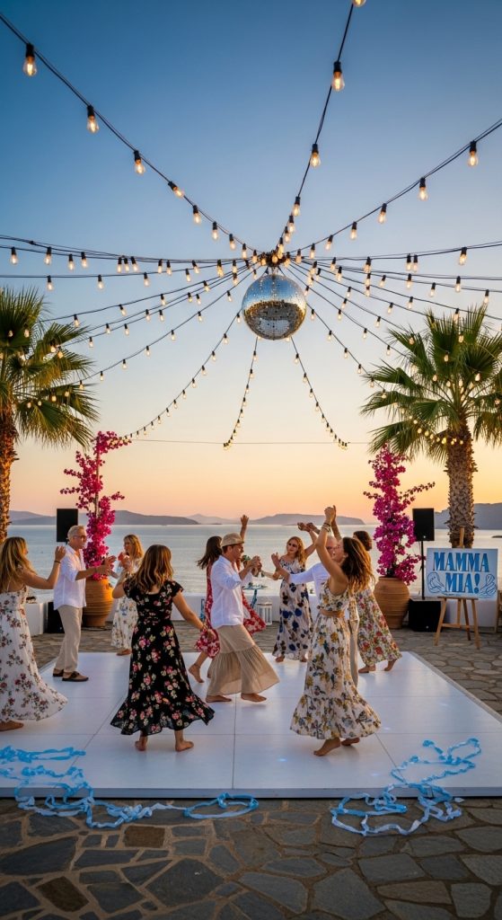 Encourage guests to dress in Mamma Mia-inspired outfits. Flowy dresses, floral prints, linen fabrics, and earthy tones work beautifully. Bridesmaids can coordinate in shades of white and blue, while guests can embrace bohemian beachwear. Think wide-brim hats, sandals, and statement jewelry for a relaxed yet stylish vibe.