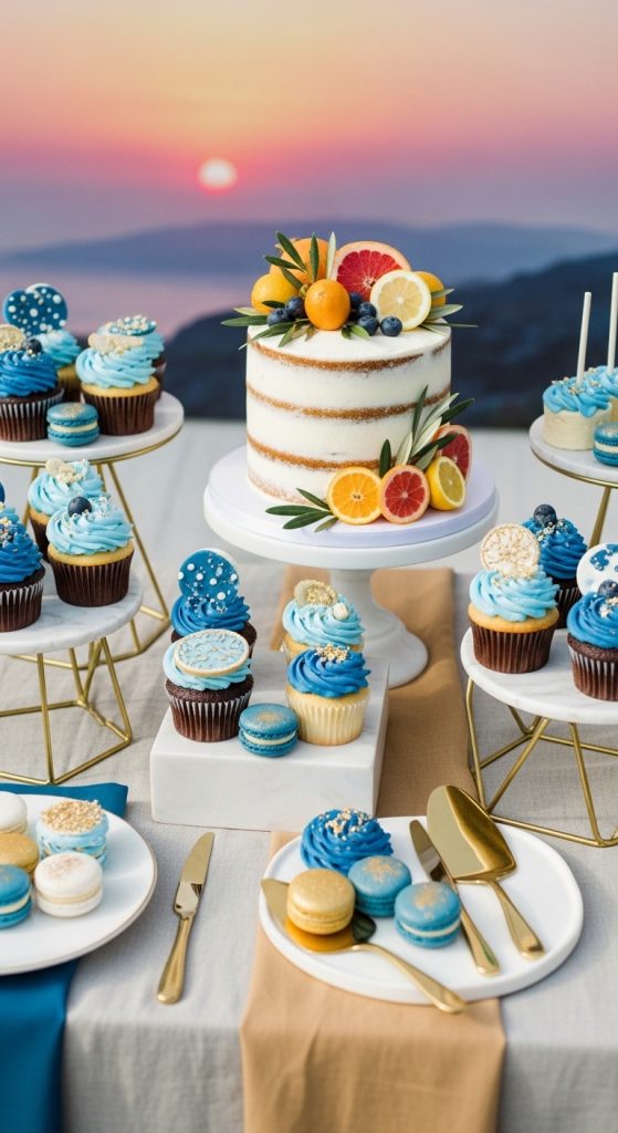 Finish the celebration with a stunning dessert table inspired by a Greek sunset. Use shades of blue, white, and soft gold for the cake design. Consider a semi-naked cake decorated with fresh flowers, citrus fruits, or gold accents. Pair it with treats like cupcakes, macarons, and cookies styled in the same color palette.