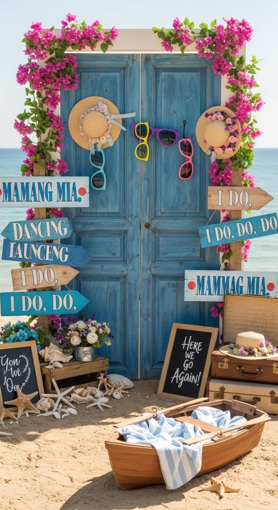 Set up a photo booth with themed props such as oversized sunglasses, feather boas, floppy hats, and signs with iconic Mamma Mia quotes. Add a backdrop of blue doors or a seaside scene to complete the aesthetic. This will give guests a fun keepsake and create lasting memories.