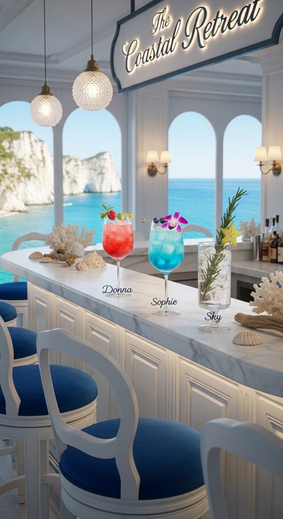 Create a themed drink station inspired by the movie’s characters. Name cocktails or mocktails after Sophie, Sky, Donna, and the Dynamos. For example:
