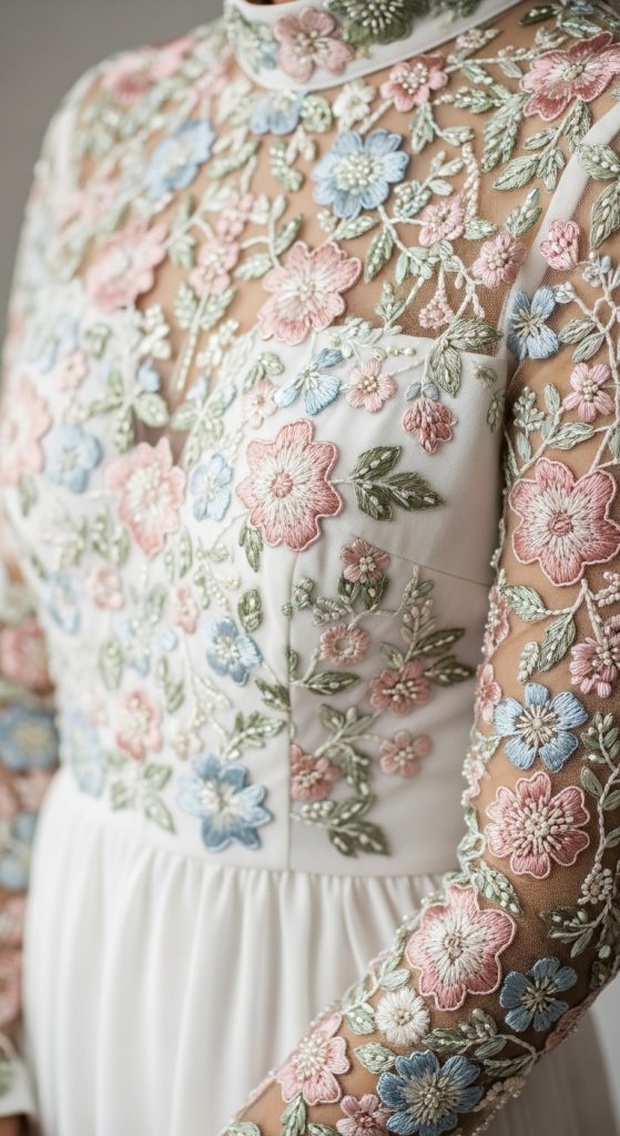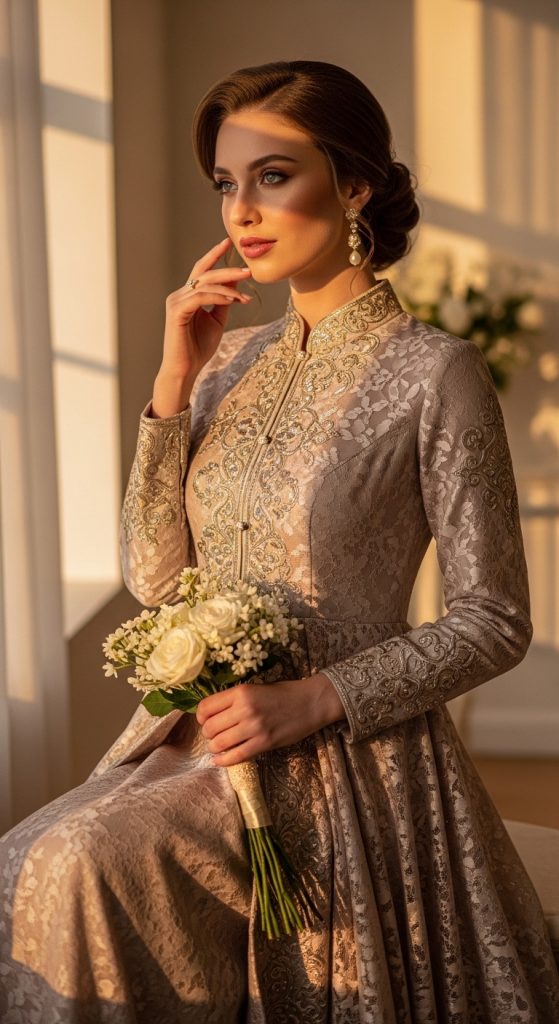 Embroidery adds a touch of artistry and uniqueness to any outfit. A modest embroidered dress can feature delicate floral or geometric patterns, enhancing its visual appeal without needing bold cuts or embellishments. This style is perfect for brides who appreciate craftsmanship and want a dress that stands out in a subtle, elegant way.