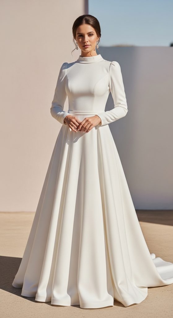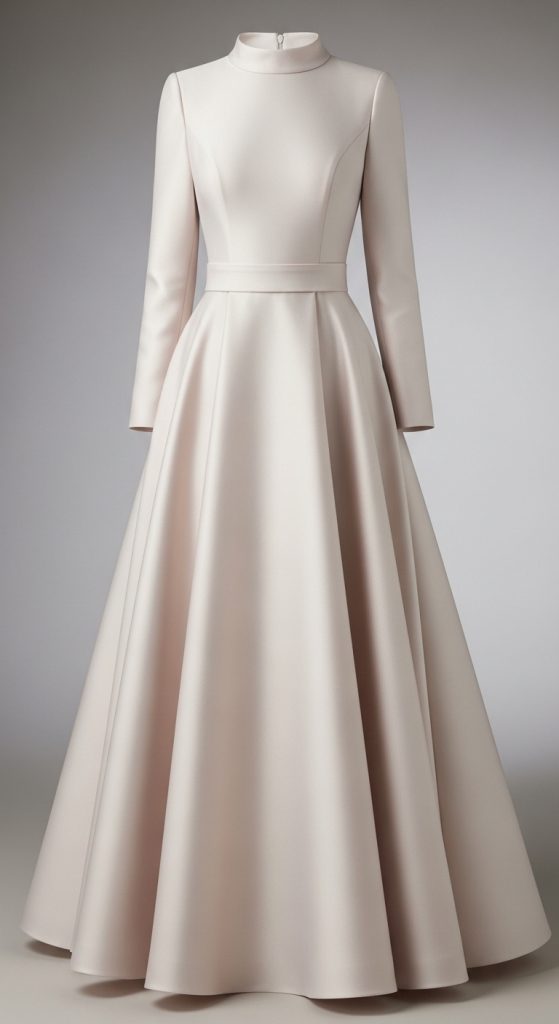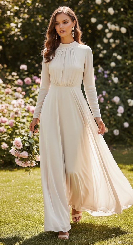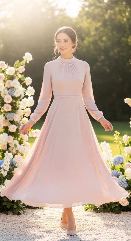 The A-line dress is a timeless choice for a reason. With its fitted bodice and gently flared skirt, it creates a flattering silhouette for all body types. A modest A-line dress typically features a higher neckline and longer sleeves, making it perfect for a refined bridal shower look. Soft fabrics like chiffon or satin add a delicate, feminine touch. You can choose pastel shades like blush, ivory, or light blue for a romantic feel.