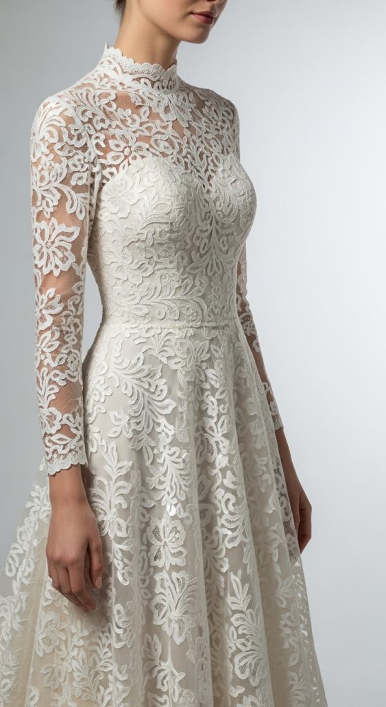 Lace is synonymous with bridal elegance. A long sleeve lace dress offers a modest yet luxurious appearance, perfect for a bride who wants to feel both covered and stylish. Lace patterns can vary from delicate floral designs to more intricate textures, adding depth and character to the outfit. Pair it with a simple updo and minimal jewelry to let the dress shine.