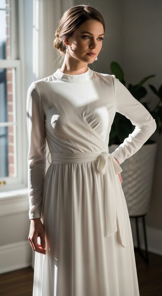 Wrap dresses are known for their adjustable fit and flattering design. For a modest bridal shower look, opt for a wrap dress with a higher neckline and long sleeves. The wrap style accentuates the waist while allowing for comfortable movement. This style is ideal for brides who want a balance between sophistication and ease.