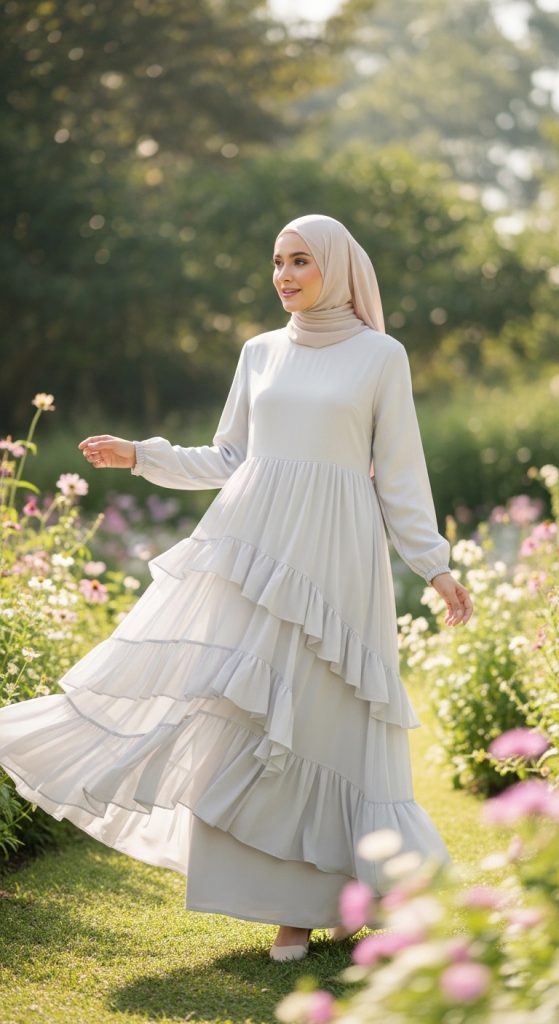 For brides who enjoy a playful yet modest look, a tiered ruffle dress is a wonderful choice. The layered design creates movement and texture while maintaining full coverage. Opt for soft, muted colors and lightweight fabrics to keep the dress looking elegant rather than overly dramatic. This style is perfect for a cheerful and lively bridal shower atmosphere.