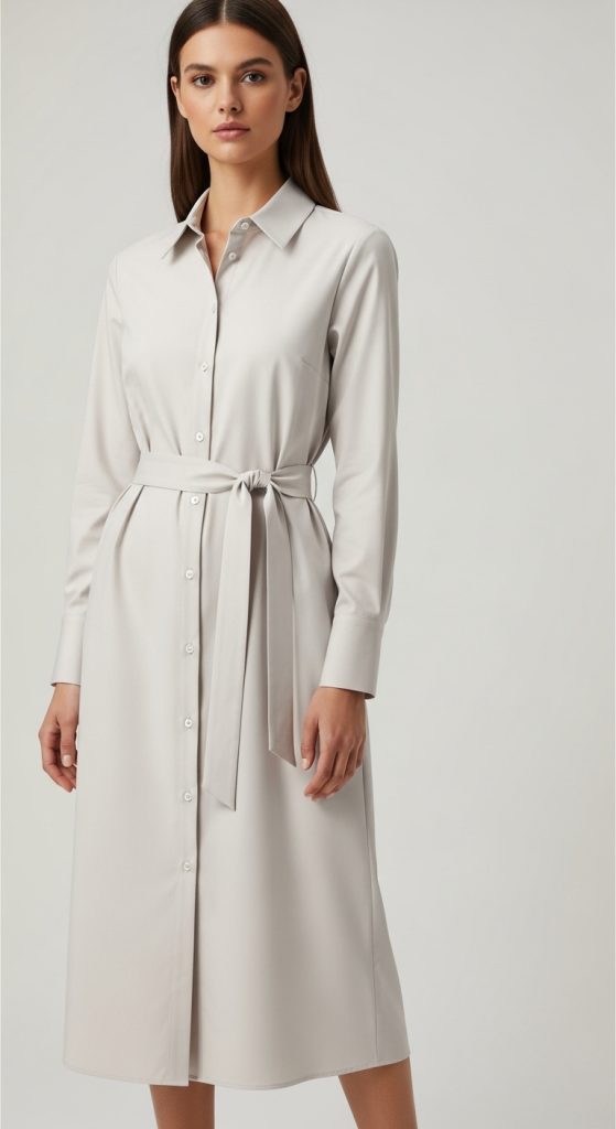 A button-down shirt dress offers a modern and minimalist take on bridal shower fashion. When styled modestly with long sleeves and a longer hemline, it creates a clean and sophisticated look. You can cinch the waist with a belt to add shape or keep it loose for a relaxed feel. This dress style is ideal for casual or semi-formal bridal showers.
