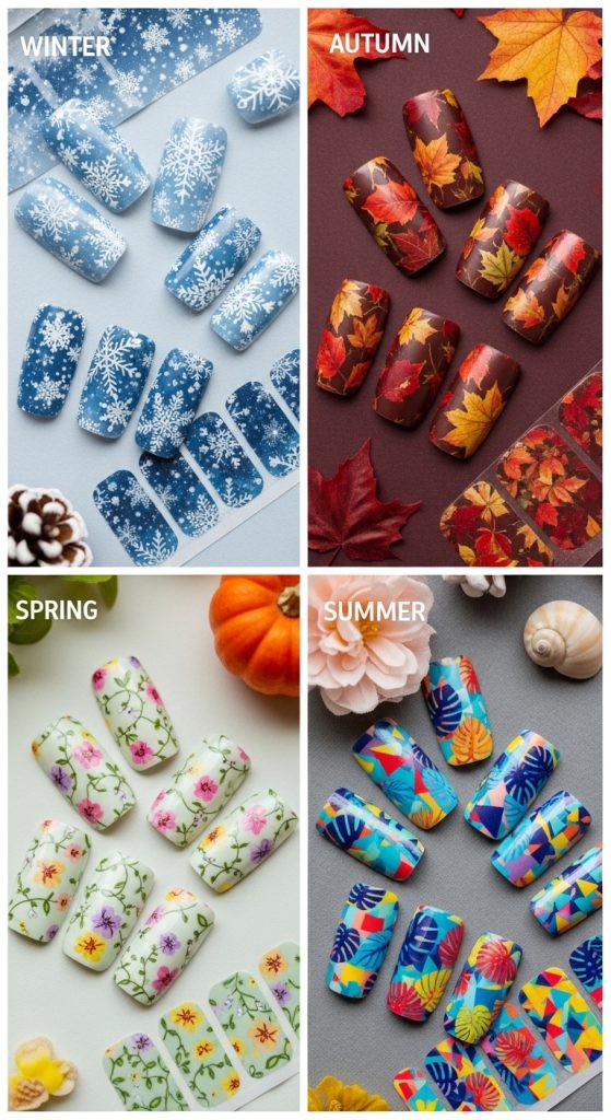 Nail wraps can also reflect the time of year or special occasions. Think snowflakes and icy blues for winter, pumpkins and warm tones for autumn, or bright florals for spring. Holiday-themed wraps—like Christmas, Halloween, or Valentine’s Day—add a festive touch to your style.