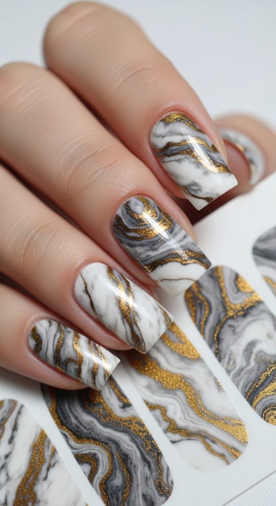 Marble nail wraps give your nails a high-end, luxurious look reminiscent of natural stone. Typically featuring swirls of white, gray, black, or even gold, these designs mimic the elegance of marble countertops.
