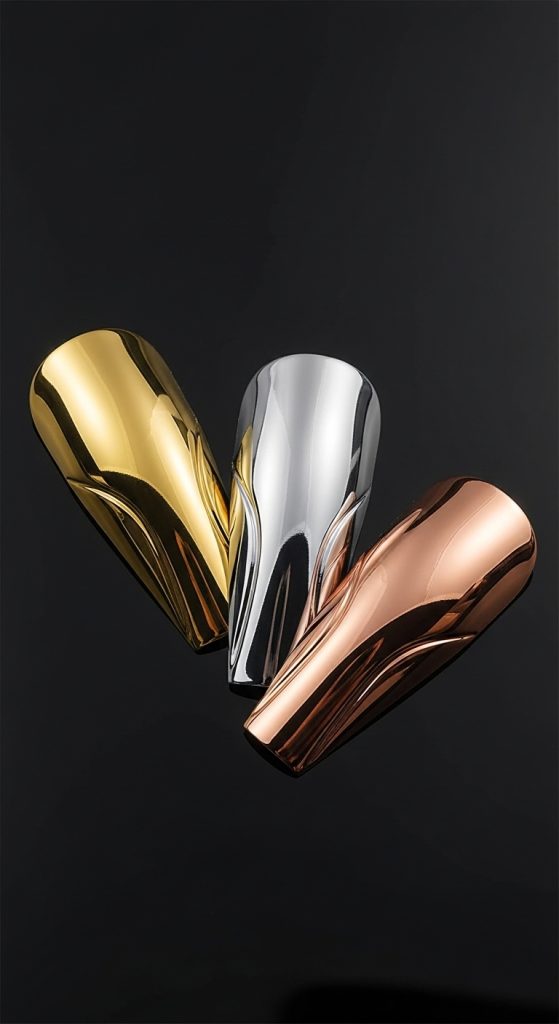Metallic nail wraps in shades of gold, silver, rose gold, or chrome give your nails a futuristic and high-shine appearance. These wraps reflect light beautifully and create a mirror-like effect that’s hard to ignore.