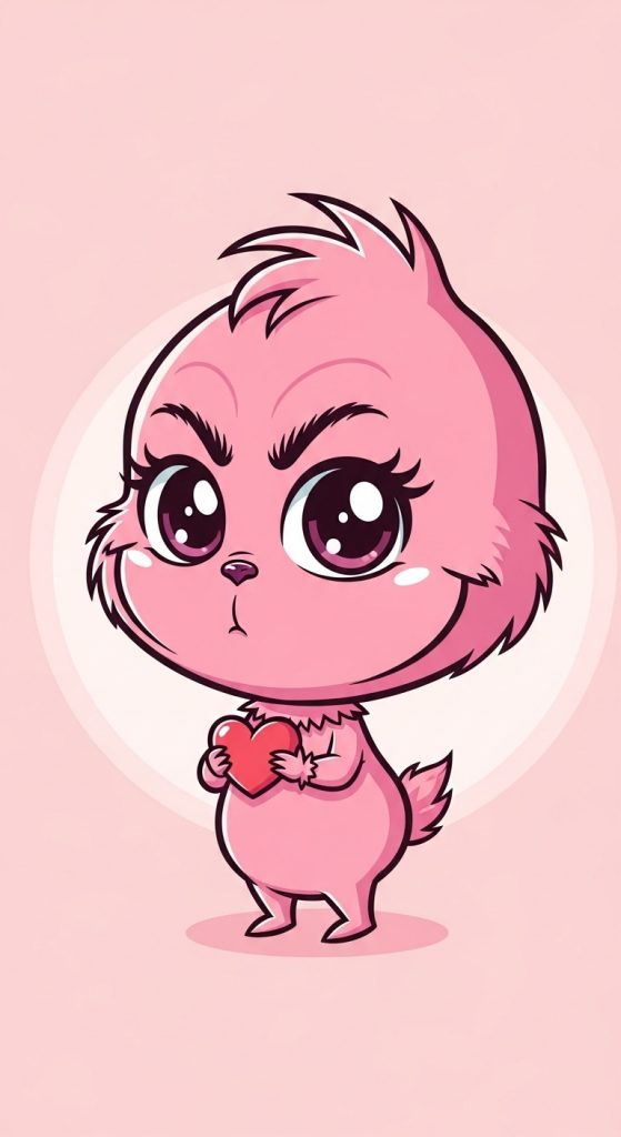A chibi-style Grinch in pink is one of the cutest wallpaper ideas you can choose. Chibi art features small, cartoonish characters with big eyes and exaggerated expressions.