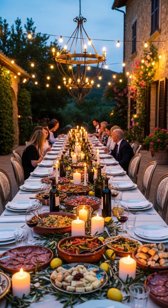 Decorate with wine bottles, candles, and rustic table settings. Serve pasta, antipasti, and Italian desserts like tiramisu or cannoli. This theme focuses on togetherness, warmth, and delicious food.