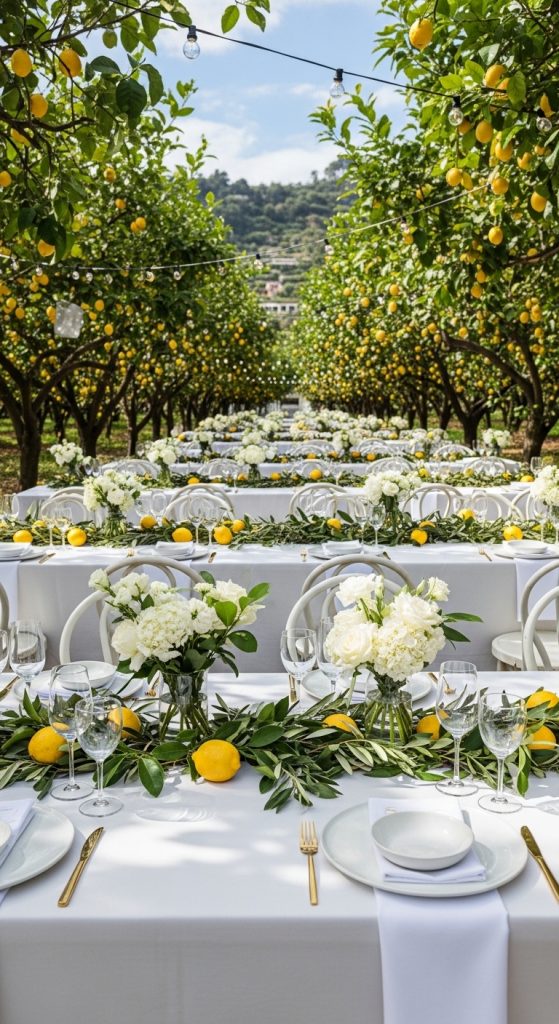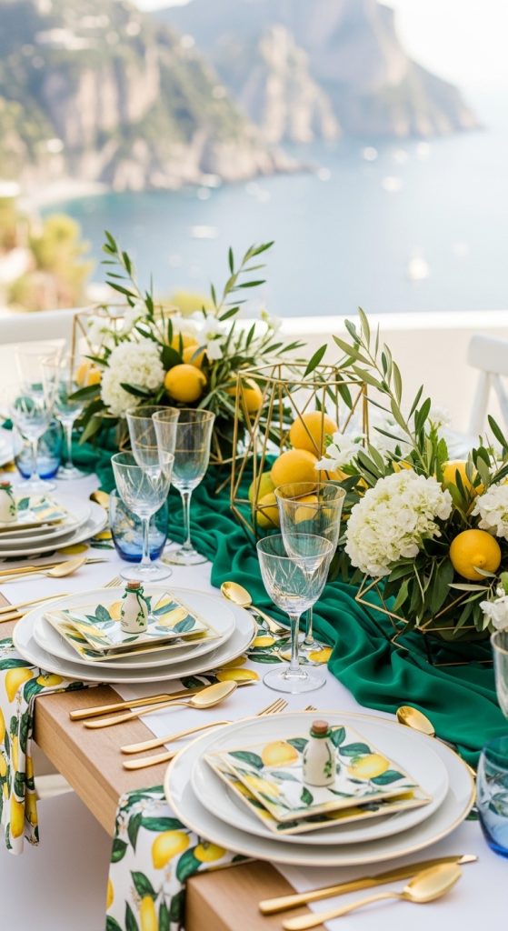 Nothing says Amalfi Coast quite like fresh lemons. A lemon grove theme captures the region’s iconic citrus vibe with a bright and refreshing aesthetic. Decorate with lemon centerpieces, lemon-patterned linens, and greenery to mimic a Mediterranean orchard.