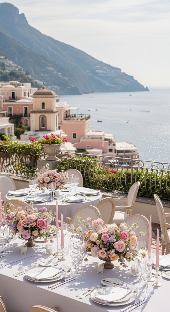 Positano is famous for its colorful cliffside buildings, which inspire a pastel-themed bridal shower. Think soft shades of pink, peach, lavender, and sky blue.