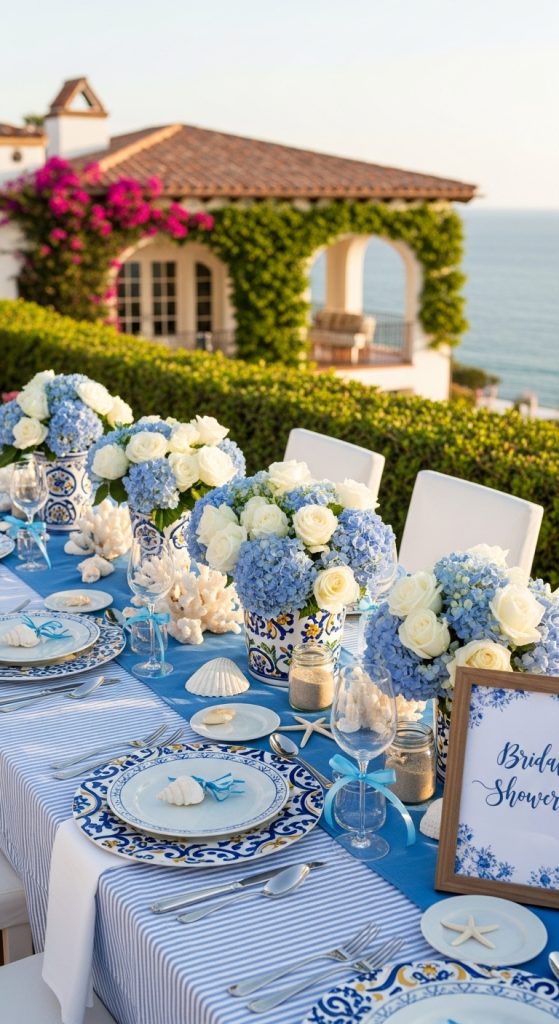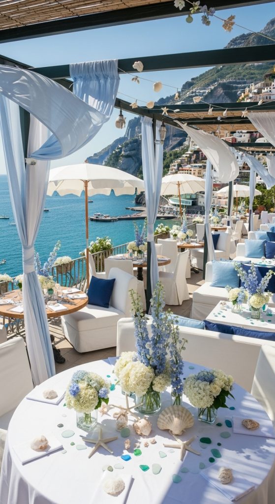 Bring the beach to your bridal shower with a coastal theme inspired by the Amalfi shoreline. Use seashells, driftwood, and soft blue tones to create a relaxed beach club vibe.