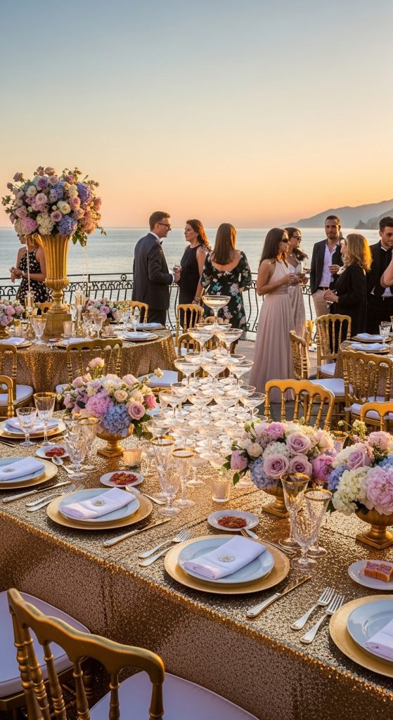 Bring the Amalfi Coast’s lush gardens into your venue with a garden party theme. Fill the space with vibrant flowers, ivy, and potted plants.