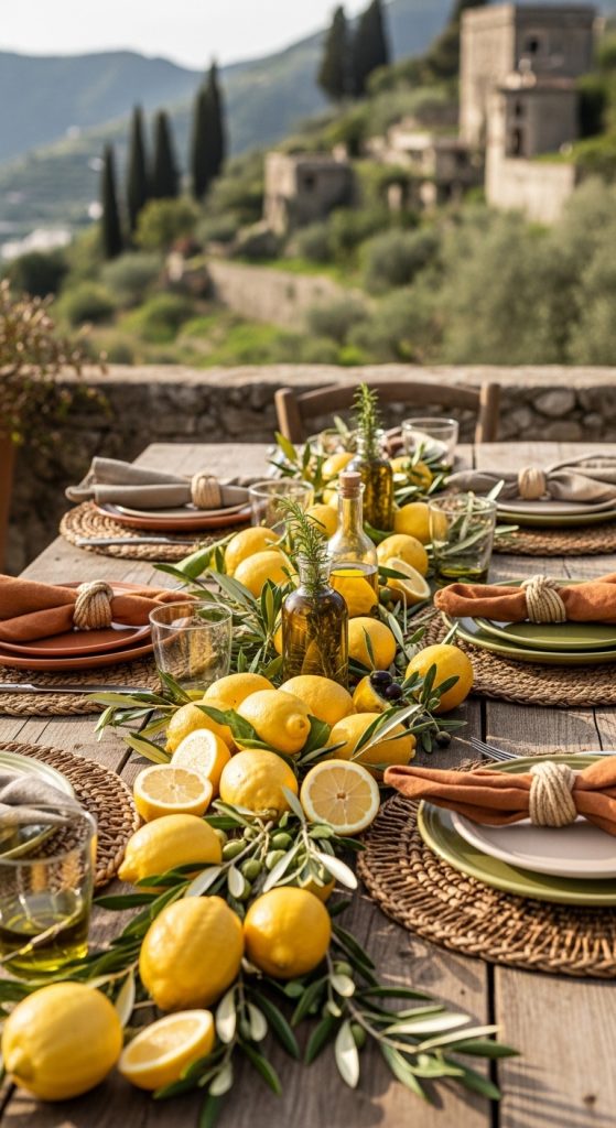Combine two iconic Mediterranean elements—lemons and olives—for a rustic yet charming theme. Use wooden tables, olive branches, and citrus fruits to create a cozy, countryside feel.
