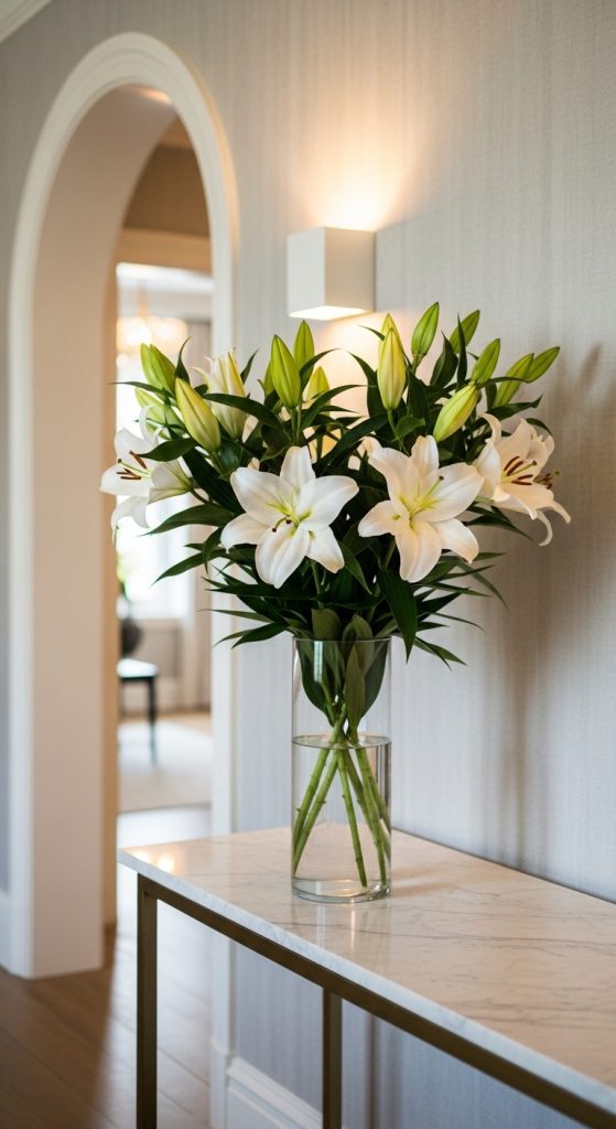 Lilies are known for their graceful appearance and soothing fragrance. They represent purity, renewal, and positivity, making them ideal for a new home. White lilies create a sense of peace and serenity, while orange lilies add a vibrant and energetic touch. A tall vase filled with lilies can make a striking centerpiece in a living room or dining area.