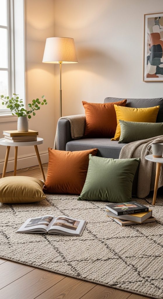Turn a corner of your home into a staged mini living room. Add a stylish couch, cushions, a rug, and decorative items like books or candles. This setup makes your photos feel natural and candid, as if capturing real moments in your new home.