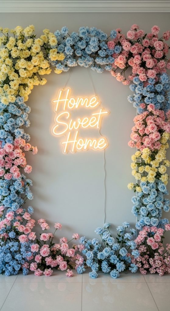 Nothing says warmth and comfort like a floral-themed backdrop. Create a wall filled with artificial or fresh flowers in soft pastel tones and add a “Home Sweet Home” sign in the center. This elegant setup works beautifully for both daytime and evening events. It gives your photos a soft, welcoming vibe and symbolizes the blossoming of a new chapter.