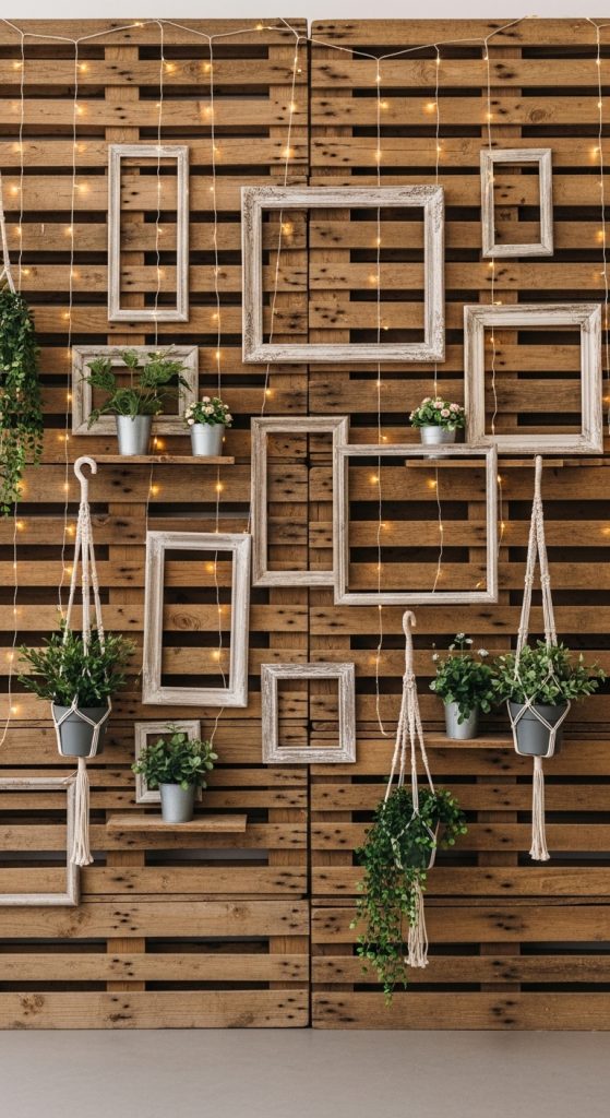 For a cozy and earthy aesthetic, use wooden pallets as your backdrop base. Decorate them with fairy lights, small potted plants, and hanging frames. You can even attach photos of your journey to the new home. This idea is perfect if you love farmhouse or rustic décor styles.