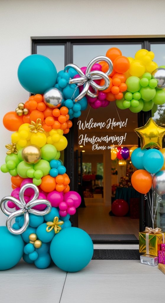Balloon arches are vibrant, festive, and incredibly versatile. Choose colors that match your home’s interior theme or go bold with metallics and contrasting shades. Add a neon sign or a custom message like “Cheers to New Beginnings” to make it pop. This backdrop instantly energizes your party atmosphere.