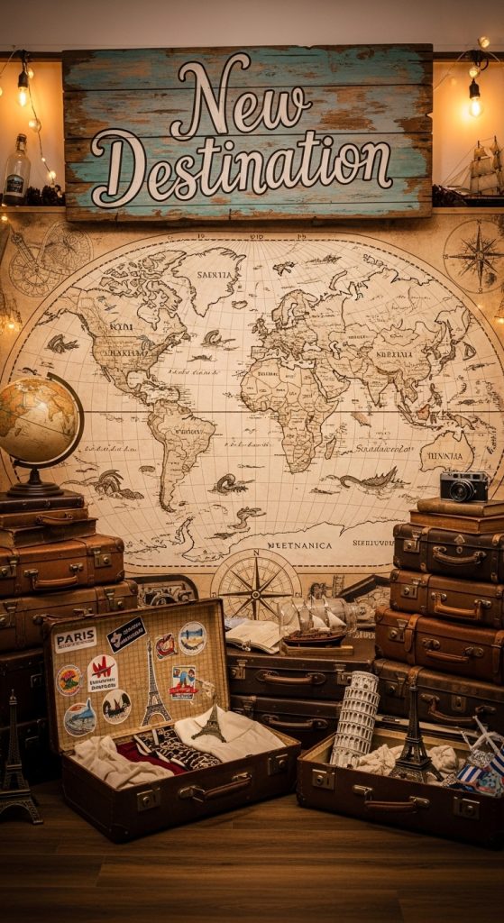 Celebrate your journey to your new home with a travel-inspired setup. Include suitcases, maps, globes, and signs like “Our New Destination.” This idea works especially well if you’ve relocated from another city or country, making your housewarming story even more meaningful.