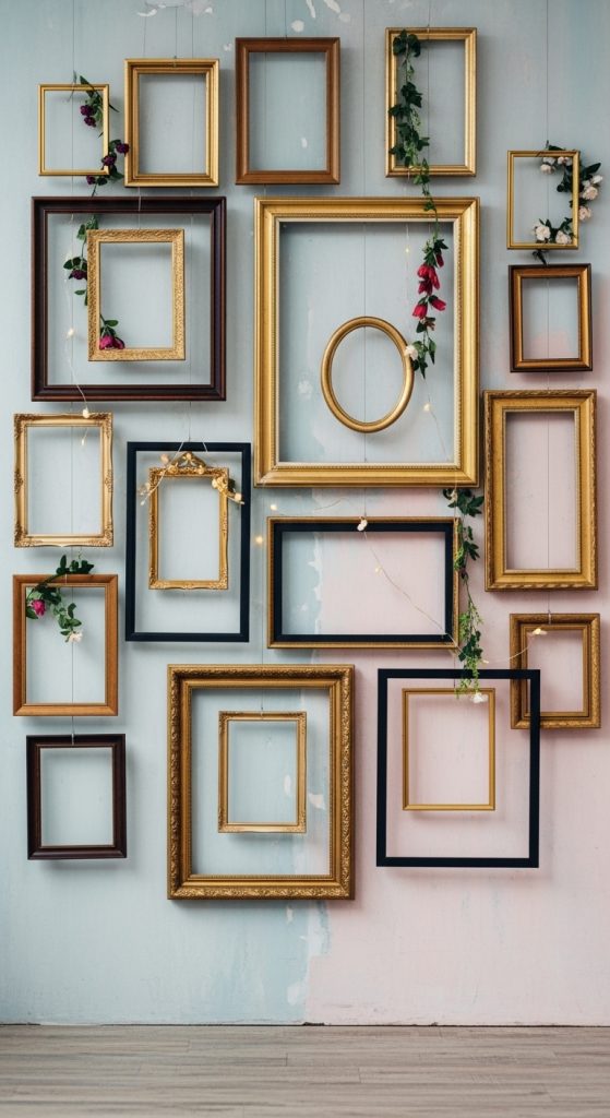 Create a fun and interactive backdrop using empty picture frames of different sizes and styles. Hang them against a wall or suspend them from above. Guests can pose inside the frames, creating playful and dynamic photos. It’s simple, affordable, and highly customizable.