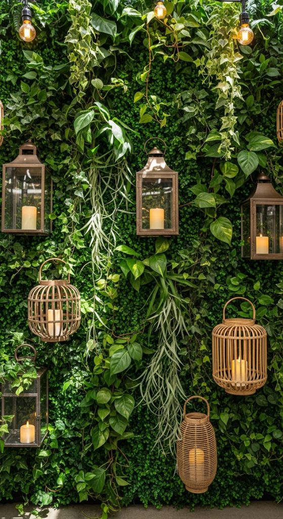 Bring nature indoors with a lush green backdrop made of artificial grass panels, vines, or real plants. Add hanging lanterns or wooden signs for extra charm. This refreshing setup gives your photos a lively and organic feel, perfect for nature lovers.