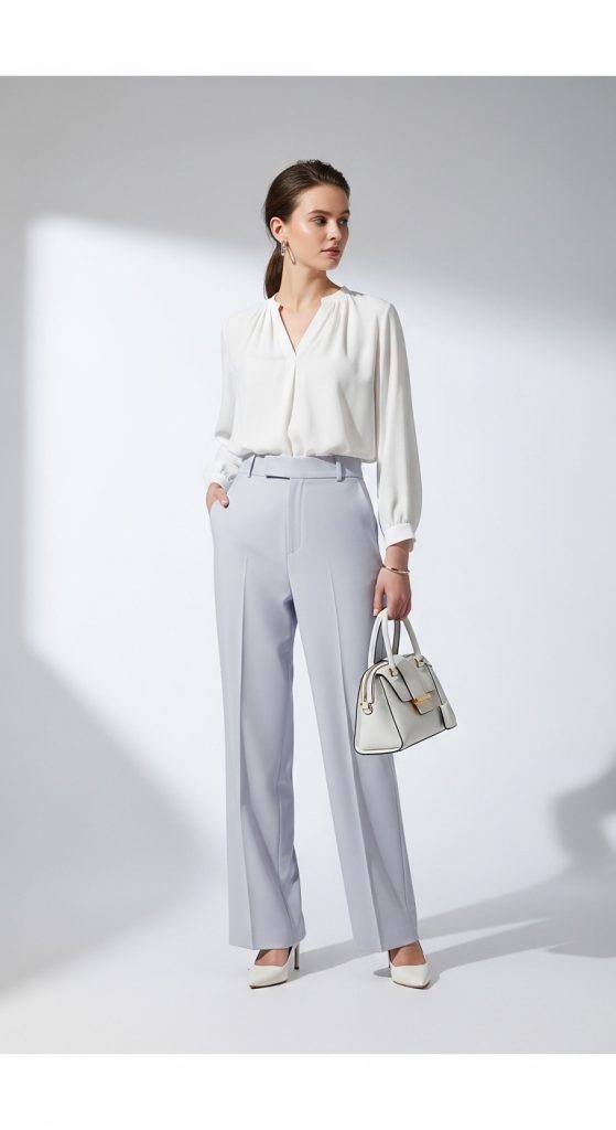 2. Elegant White Blouse with Pastel Trousers