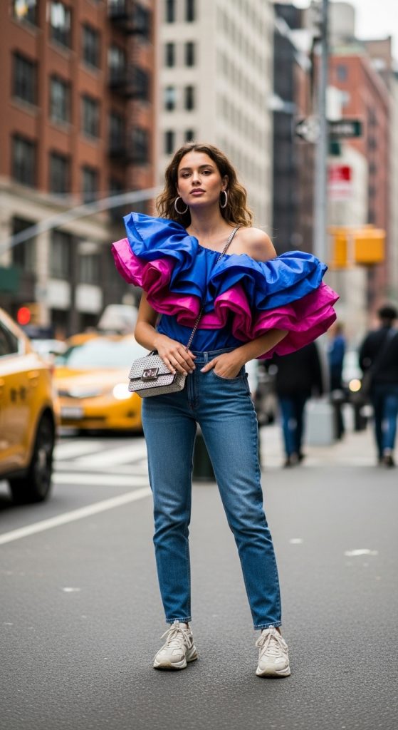 If you prefer a more relaxed vibe, go for high-waisted jeans paired with a stylish statement top. Think ruffles, lace details, puff sleeves, or embroidery. This outfit strikes the perfect balance between casual and put-together. Add sneakers for comfort or heels for a more elevated finish.