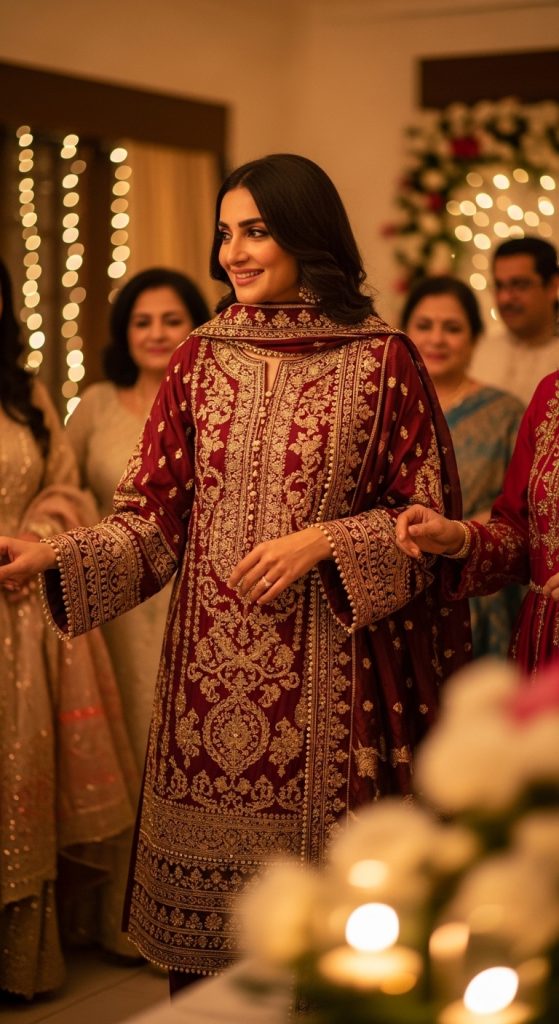 A traditional outfit like a shalwar kameez or kurta set can be modernized with contemporary cuts, pastel shades, or minimal embroidery. Pair it with chic flats or khussas for comfort. This look is especially great for family gatherings where cultural elegance is appreciated.