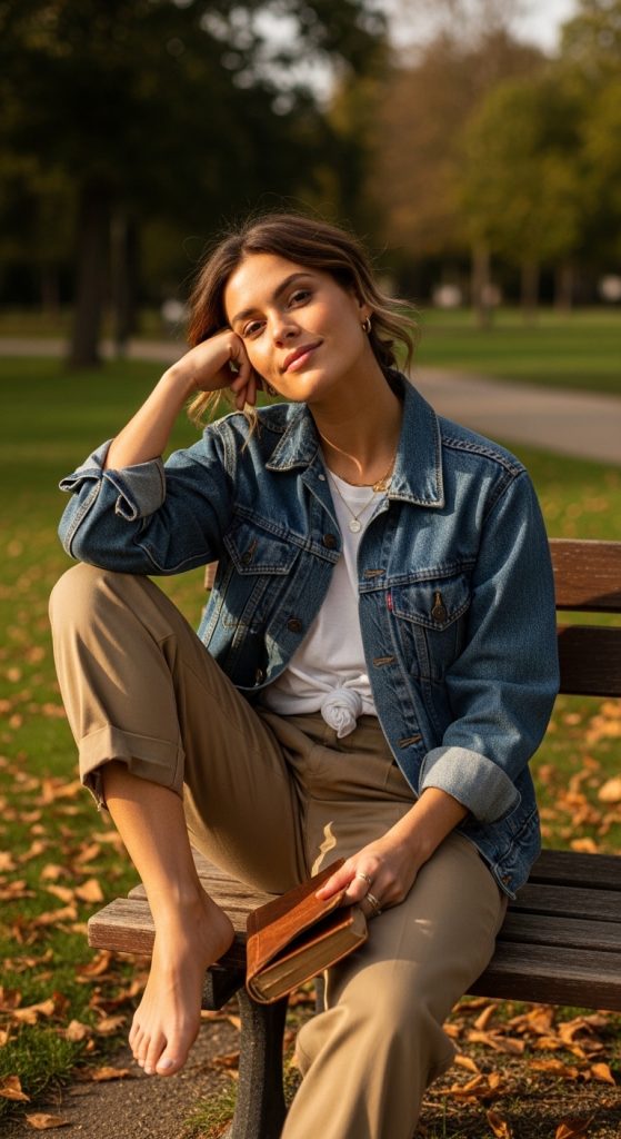 A simple knee-length dress paired with a denim jacket is a stylish and practical option. It works well for relaxed outings like park visits or casual lunches. You can pair it with sneakers for a sporty touch or sandals for a softer look. This outfit is all about comfort with style.