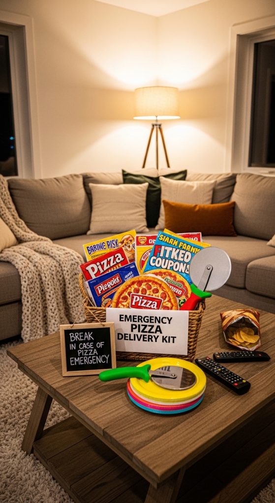 Moving day is exhausting. After lifting boxes and assembling furniture, nobody wants to cook. That is why an emergency pizza delivery kit is both funny and useful. Put together a small basket containing frozen pizza, pizza coupons, paper plates, napkins, and maybe a pizza cutter.