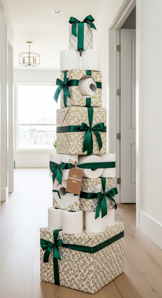 A giant stack of toilet paper may sound silly, but it is surprisingly practical. Wrap multiple rolls in a creative tower shape with ribbon and a tag that says, “The true luxury item of every home.”