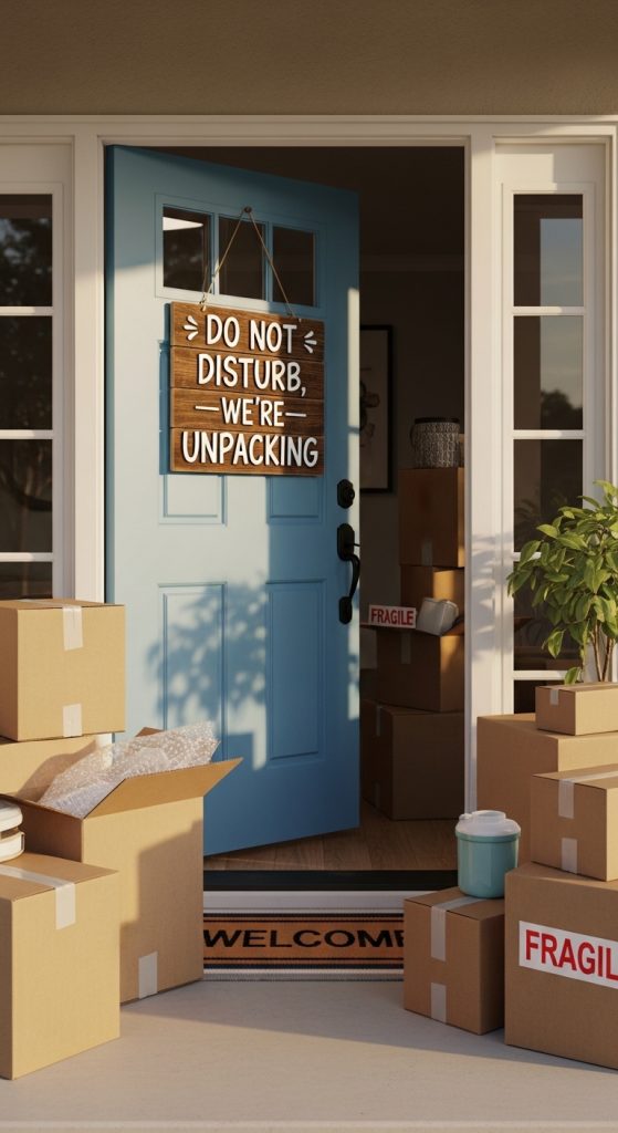 A custom door sign is a fun way to acknowledge the chaos of moving in. You can personalize it with the family name or a funny message like, “Knock only if you brought snacks.”