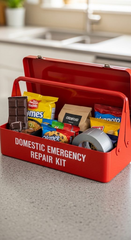 Take a small toolbox and fill it with funny essentials: chocolate, instant noodles, coffee sachets, bandages, tape, and headache tablets. Label it “Domestic Emergency Repair Kit.”