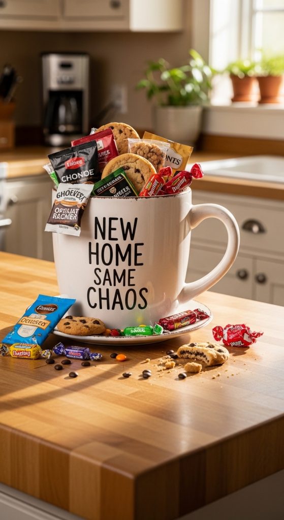 A giant coffee mug with words like “New Home, Same Chaos” or “Property Owner Fuel Tank” makes an excellent funny gift. Fill it with coffee sachets, tea bags, candy, or cookies.