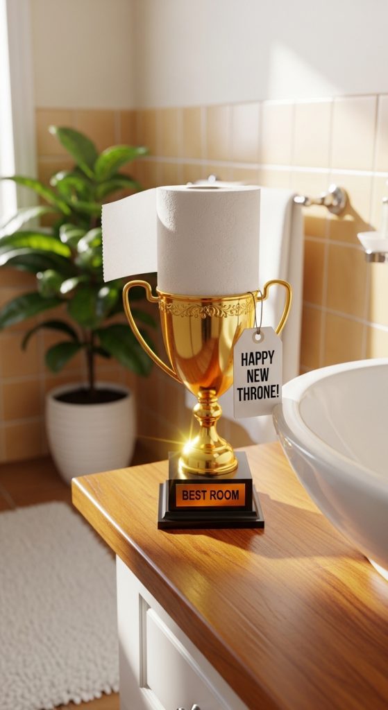 Every homeowner quickly learns that running out of toilet paper is a household crisis. Turn this everyday necessity into a comedy masterpiece by presenting a single roll of toilet paper mounted on a trophy stand. Label it “For Emergencies Only.” It is inexpensive, funny, and oddly practical at the same time. Guests will laugh, and the homeowners might actually keep it in the bathroom as decoration.