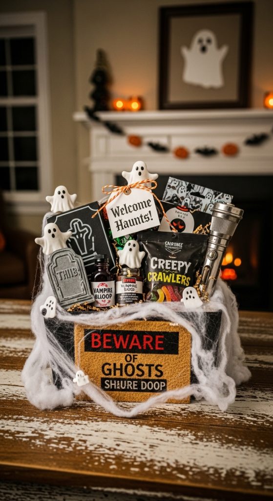 For friends who moved into an older home, create a spooky-themed gag basket with fake cobwebs, toy ghosts, a flashlight, and a note reading, “In case the house has previous tenants.” This gift works especially well around Halloween or for anyone who enjoys horror movies and ghost stories.