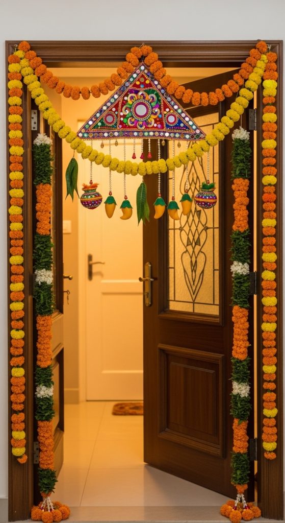 The entrance is considered the “mouth of energy” for any home. Decorating your main door with symbolic items can invite positivity right from the start. You can use fresh flower garlands, hanging torans, wreaths, or even a simple “welcome” sign with natural elements like leaves or wood. Many people also place protective symbols or nameplates to personalize the energy. A clean, well-lit entrance combined with soft decorative accents creates a warm first impression and encourages positive energy flow.