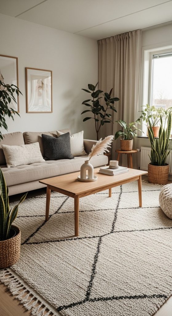 A well-chosen rug anchors a room and adds instant warmth underfoot. Large area rugs in neutral patterns or subtle geometric designs work especially well in modern cozy interiors.